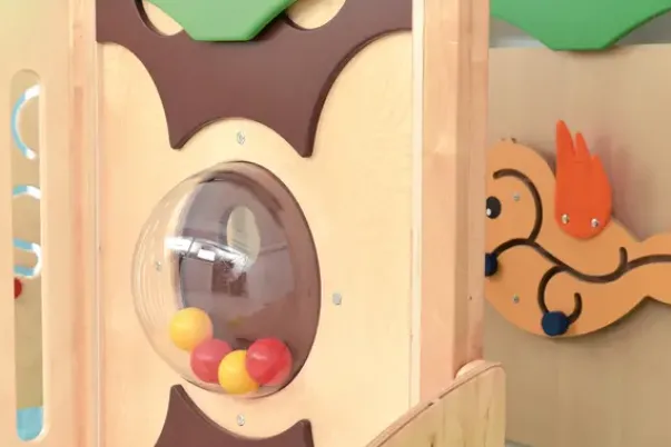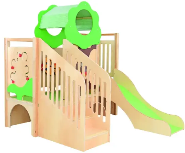 Dette lekehjørne kommer med mange morsomme elementer – sklie, trapper, tunneler, speil, vegglaburinter og vinduskuppek med baller. Det er utført i kryssfiner, tre, laminat og fargerike MDF-plater. Kikkhullet er laget av pleksiglass,