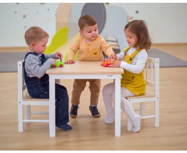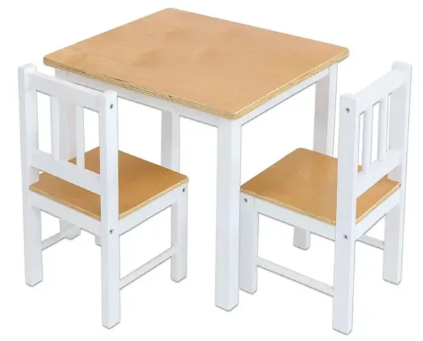 Sett med lekebord og 2 stoler i kryssfiner og furu.