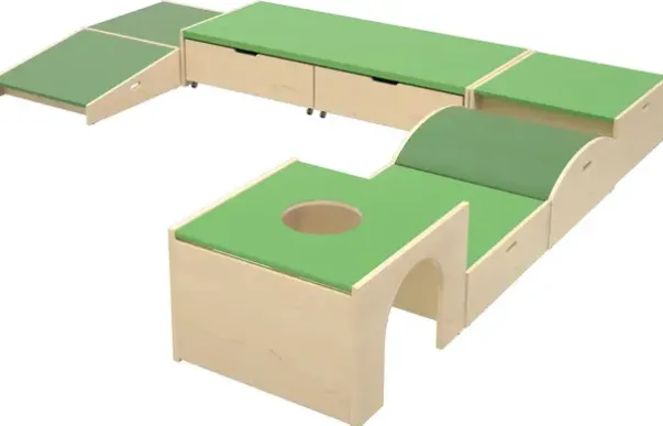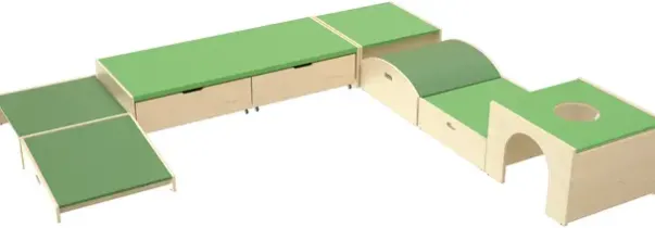 Lekepodiesett utført i lakkert kryssfiner med Tretford teppe på topplate. Tretfor teppet består av en blanding av ull fra sau og geit og er et godt miljvennlig valg. Settet består av ulike deler som kan settes samme ut i fra eget ønske og plass i rommet. Modul med vindu er laget med sikkerhetsglass som kan gåes og leker på.