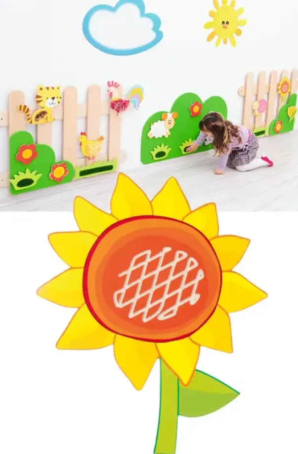 Solsikke av malt finer, som kan festes til lekevegg med magnet. Tråder i blomsterkapselen. 29,5x22cm