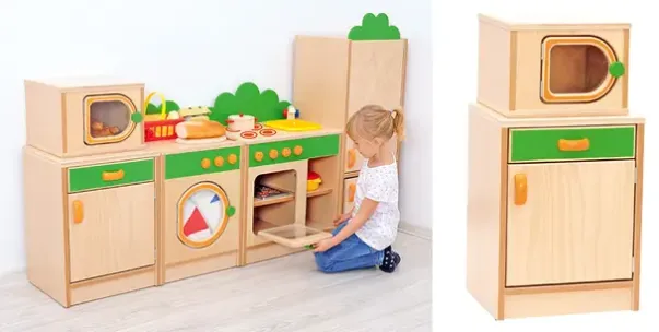 Konstruert i kryssfiner, laminerte sponplater og fargerik, lakkert MDF. Skap og mikroovn: skap H:51 x B:38 x D:32cm, mikroovn H:32 x B:30 x D:23,5cm