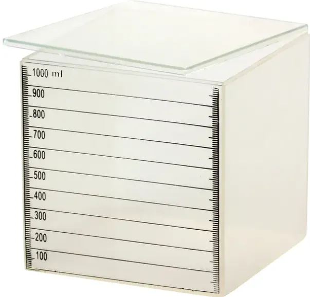 Literkube. Denne måler akkurat en liter og viser sammenhengen mellom det metriske systemet. Ytre mål: L10,4 x B10,4 x H10,6 cm