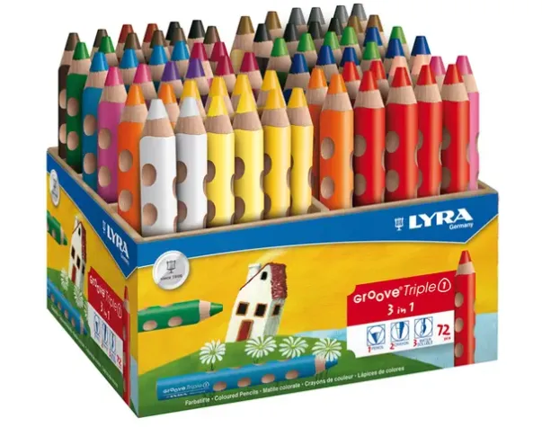 Trekantete blyanter med «grep» for tommel, pekefinger og langfinger. Passer like godt for både høyre og venstre hånd. Her er det kun fantasien som setter grenser! Med disse kan du tegne på papir, men du kan også bruke vann og male oppå, slik at du får en akvarell. Hvis du vil prøve noe nytt, kan du tegne på vinduet, og bruke en pensel med vann til å lage en morsom effekt!