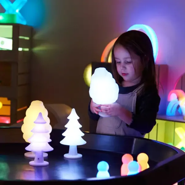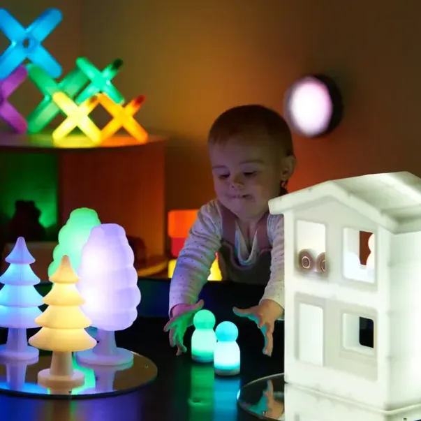 Ferdighet ogfunksjon: En liten, lysende verden forbedrer læringen ved å skape en magisk lysaktivitet der barn blir oppslukt av lysets ærefrykt og undre. Ved å bruke lyshus, lysende mennesker og lysende trær kan barn lage fantasifulle historier og fortellinger. Enkle knapper for å slå på, rotere og velge farger lar barn utforske teknologi uten skjermer.