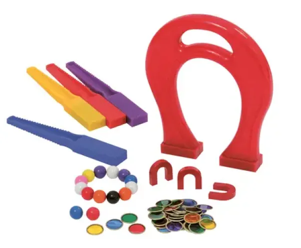 Settet inneholder 1 stor hesteskomagnet, 4 magnetstaver, 14 magnetkuler, 40 transparente brikker med magnetring og 1 liten magnethestesko.