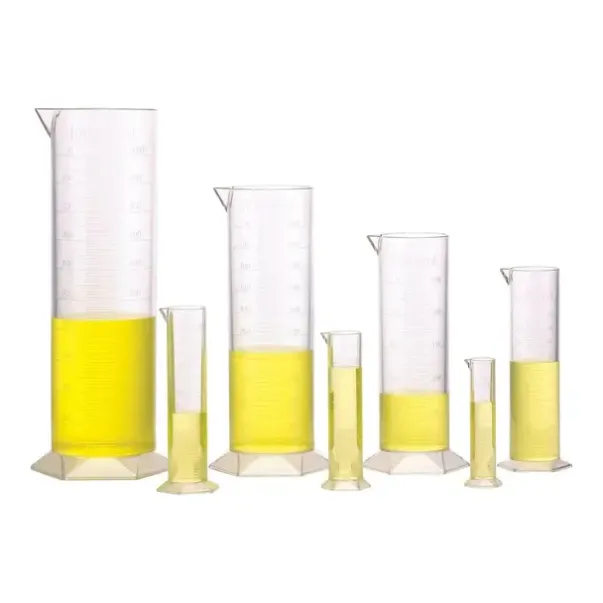 Settet består av 7 sylindere av plast, 1000ml, 500ml, 250ml, 200ml, 100ml, 50ml, 25ml. Alle har en tydelig markert skala.
