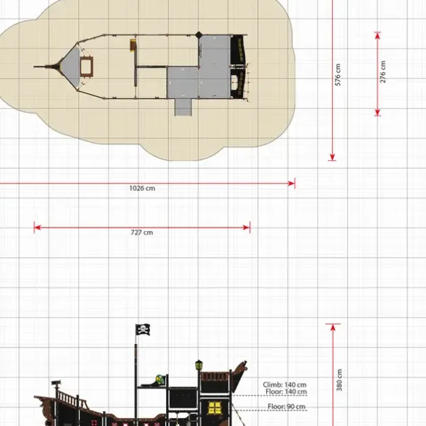Aktiviteter: Trapp, nett, plattformer, skattekiste, mast med seil, kabin, bevegelige deler, vinduer, ror, kikkert