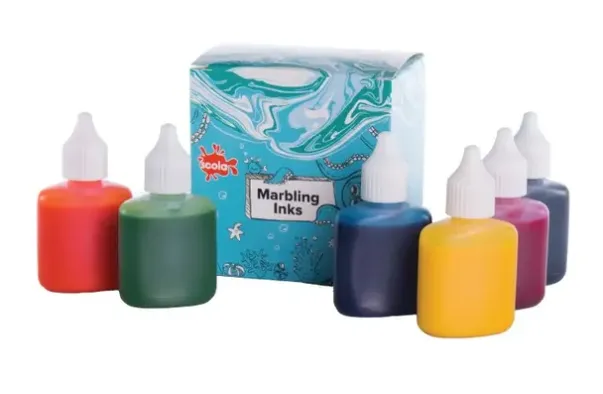 Marmorering passer på papir, gavepapir, naturtekstiler, og andre sugende materialer. Fargene er klare og sterke og flaskene er enkle å bruke.