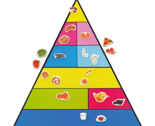 Matpyramiden er magnetisk, slik at den enkelt kan festes på tavlen eller andre overflater. 50 magnetiske brikker med bilder av ulike mat- og drikkevarer er inkludert.