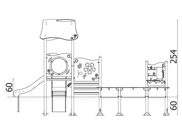 Materiale: Strukturelle elementer av rustfritt stål (Ø76,1 mm), sklie av rustfritt stål, paneler av HDPE (15 mm), plattform av antiskli HPL, skruer og beslag av rustfritt stål