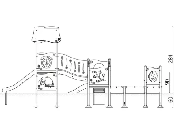 Materiale: Strukturelle elementer av rustfritt stål (Ø76,1 mm), sklie av rustfritt stål, paneler av HDPE (15 mm), plattform av antiskli HPL, skruer og beslag av rustfritt stål