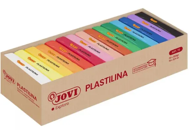 JOVI Plastilina er en plantebasert modellmasse som ikke herder. Den er lett og smidig å arbeide med og egnet for barn fra 2 år og oppover. Glutenfri og tørker aldri. Dersom leiren over tid blir hard kan den varmes lett for å bli mykere. 15 ulike farger i settet, innbyrdes blandbare.