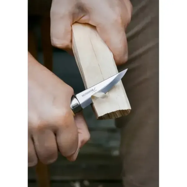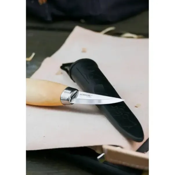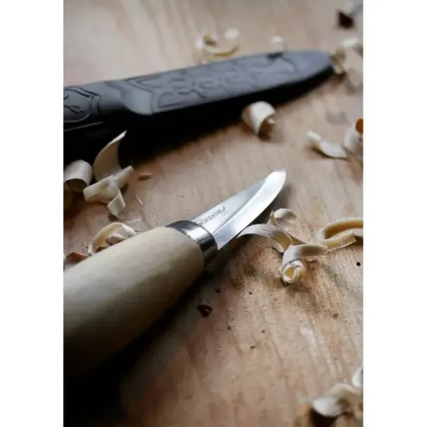 Materiale: Oljet skaft av skandinavisk FSC-sertifisert bjørk, knivblad i karbonstål, lærslire