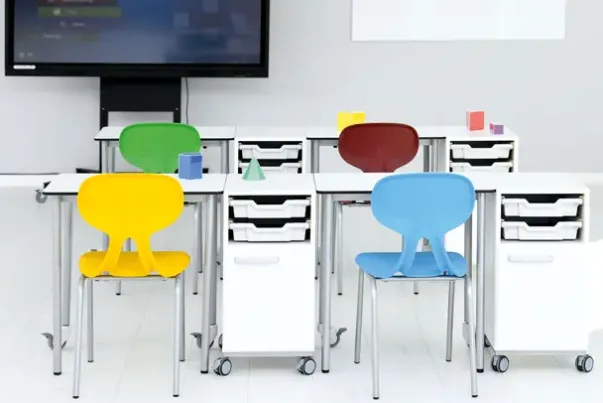 Arbeidsstasjon med krivebord/pult laget i slitesterk CDF og oppbevaringsmodul i laminert spon.