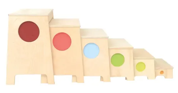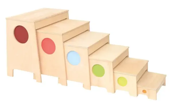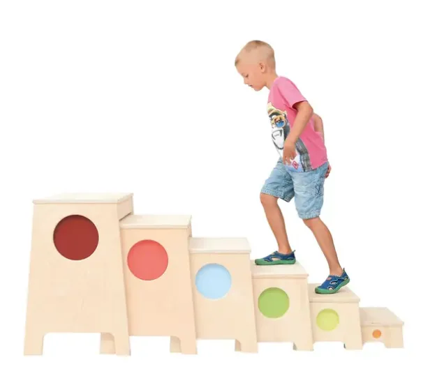 Kan brukes som trapp eller hver for seg. Flotte til bruk i terapiarbeid mot høydeskrekk eller i gymmen. Laget av kryssfiner.