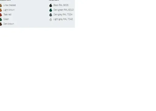 Metallfarger: Sort RAL9005, mørk grønn RAL6012, mørk grå RAL7024