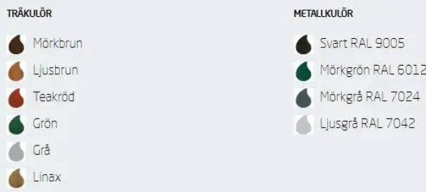 Metallfarger: Sort RAL9005, mørk grønn RAL6012, mørk grå RAL7024