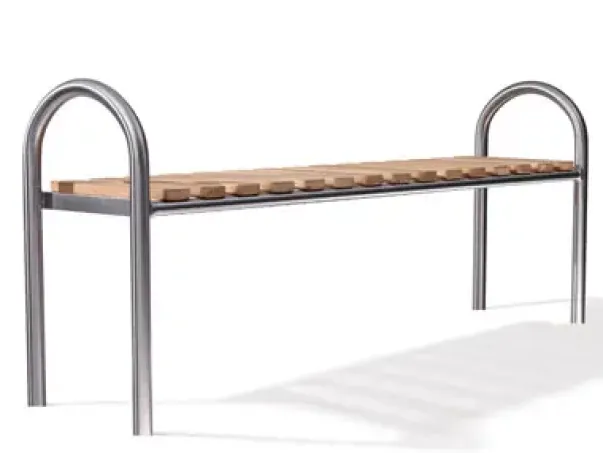 Laget i rustfritt stål og tre, sittehøyde 50cm, L: 180cm, B 45cm
