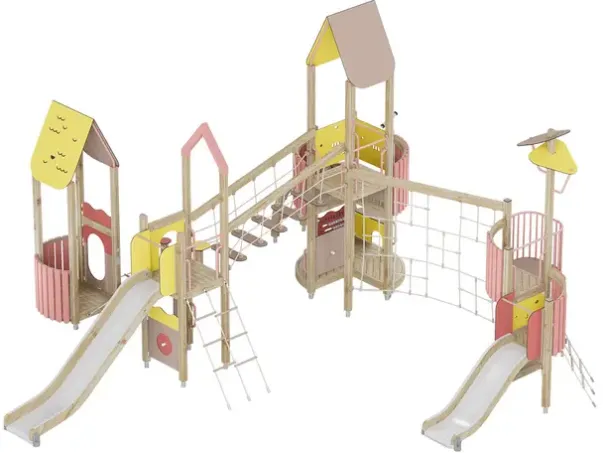 Funksjoner: Aktivitetspaneler, balansebro, klatreelementer, leketårn og sklier