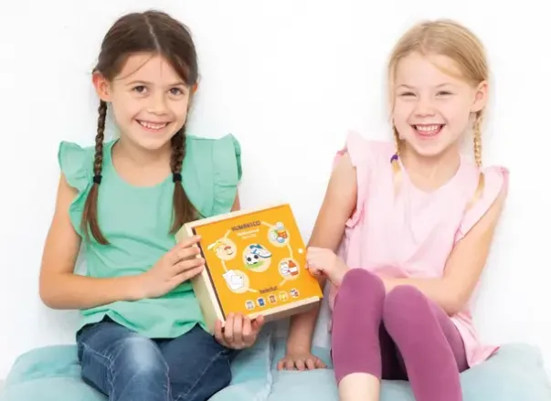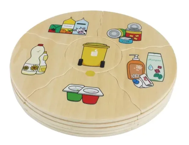 Fem puslespillbrikker får plass rundt den tilsvarende søppelkassen. Konturen til brikkene gjør det enkelt for barn å kontrollere seg selv. Følger med treboks for oppbevaring.