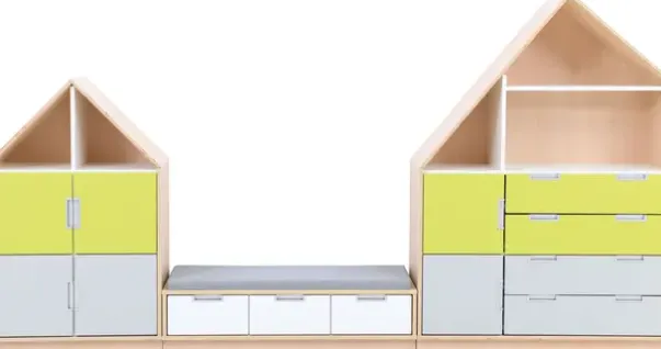 Materiale: Møbelspon 18 mm, laminat lys lønn og hvit farge, MDF