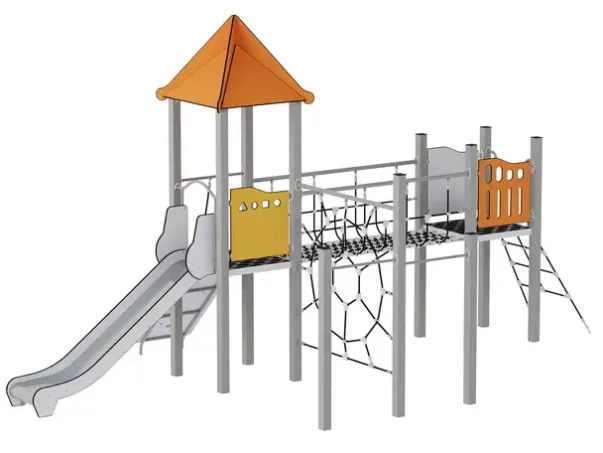 Materiale: Kvadratiske stolper (90 x 90 mm) av galvanisert og pulverlakkert S235 stål, tak og sikkerhetselementer av HDPE (15 mm), plattform med antiskli, sklie av rustfritt stål, stålforsterket tau av polypropylen (16 mm), UV- og værbestandige fester og beslag