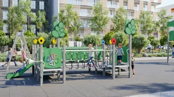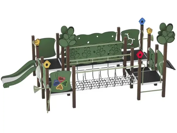 Materiale: Strukturelle elementer i 100% resikulert plast (90×90 mm), sklie av rustfritt stål, paneler av resikulert HDPE (15 mm), plattform på metallramme med antiskli, tau og nett med stålforsterket tau.