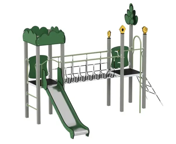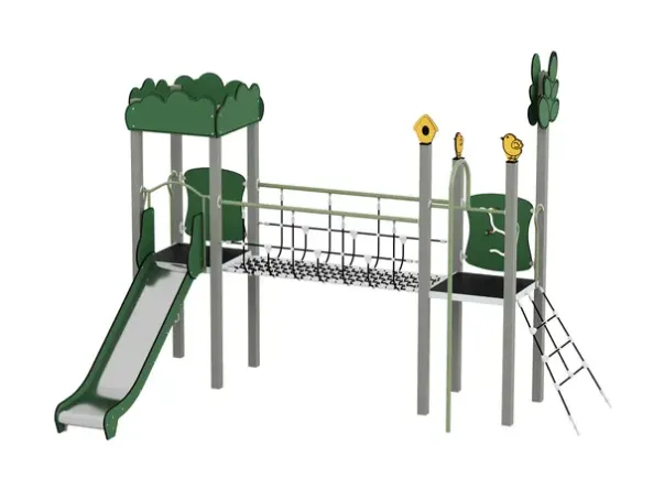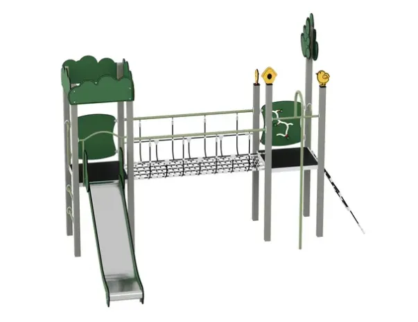 Materiale: Strukturelle elementer i 100% resikulert plast (90×90 mm), sklie av rustfritt stål, paneler av resikulert HDPE (15 mm), plattform på metallramme med antiskli, tau og nett med stålforsterket tau.