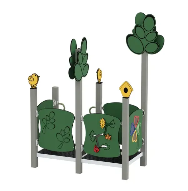 Materiale: Strukturelle elementer i 100% resikulert plast (90×90 mm), paneler av resikulert HDPE (15 mm), plattform på metallramme med antiskli,
