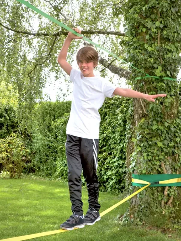Solid, komplett sett for oppsett av slakkline og topptau mellom to trær. Inkludert beskyttelsesduk for barken. Lett å lære seg balanse på lav høyde og med hjelpetau å holde i. Settet inneholder en 15 m flat line (25mm bred), toppline, 2 strammelåser i stål, 2 trebeskyttelser og bag for oppbevaring.