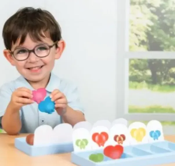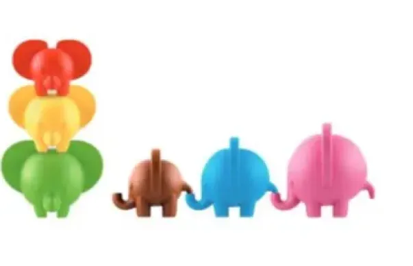 Innhold: 36 oppgavekort (L25 x B7 cm), 45 plastelefanter i 6 farger og 3 størrelser, 2 sorteringsbrett (L27 x B12 cm) og bruksanvisning.