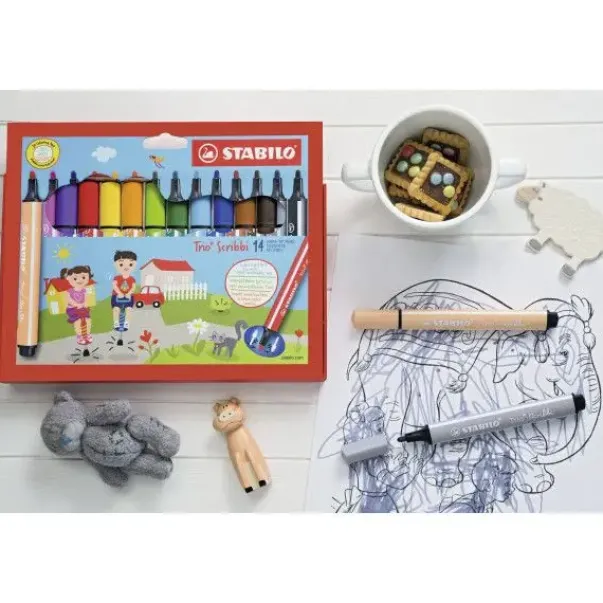 Sett med 14 STABILO tusjer. Vannbasert, vaskbart og fargeintensivt blekk. Trekantet design for et trygt, ergonomisk grep i barnehender. Linjebredde: 1,5 – 2,0 mm.
