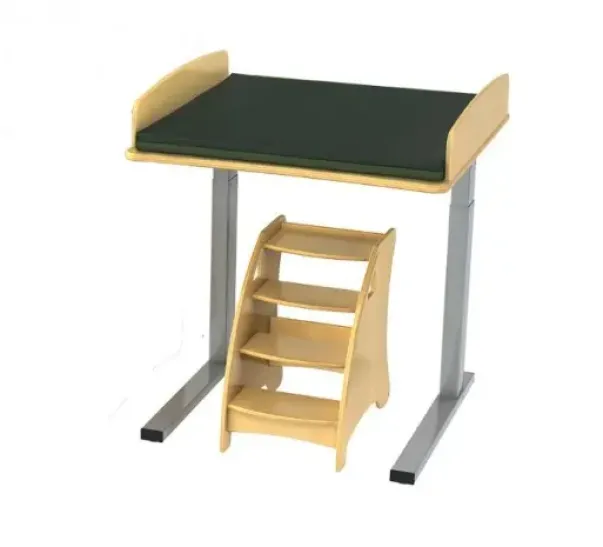 Praktisk trapp for bruk til stellebord. Stellebordstrappen er utført i bjørk og leveres med avrundede sidevanger langs hele siden av trappen. Med utfreste håndtak i sidene som barna kan holde seg fast i, eller voksne kan bruke ved flytting av trappen.