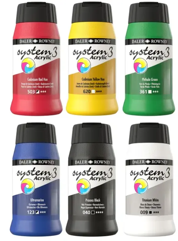 Daler-Rowney System3 Akryl er allsidige vannbaserte farger laget av pigmenter av høy kvalitet. System3 akrylfarger er lette, permanente, ugjennomsiktige (kan variere mellom farger), fleksible og tørker raskt, noe som gjør dem egnet for de fleste overflater både innendørs og utendørs.