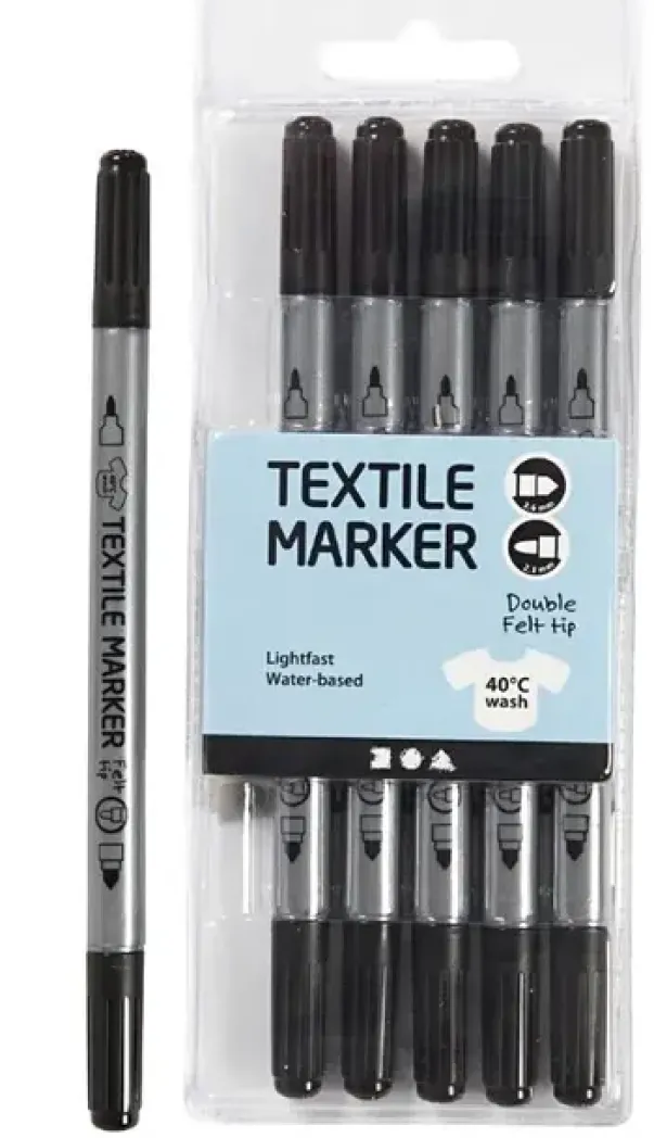 Rist tusjen godt før bruk og legg plast eller papp inni f.eks. T-skjorter og handleposer slik at fargen ikke trekker gjennom og gnis av. Når fargen er tørr, kan du stryke bakepapir over og under tekstilbiten. Etter stryking holder fargene seg vakre når de vaskes opp til 40 °C.