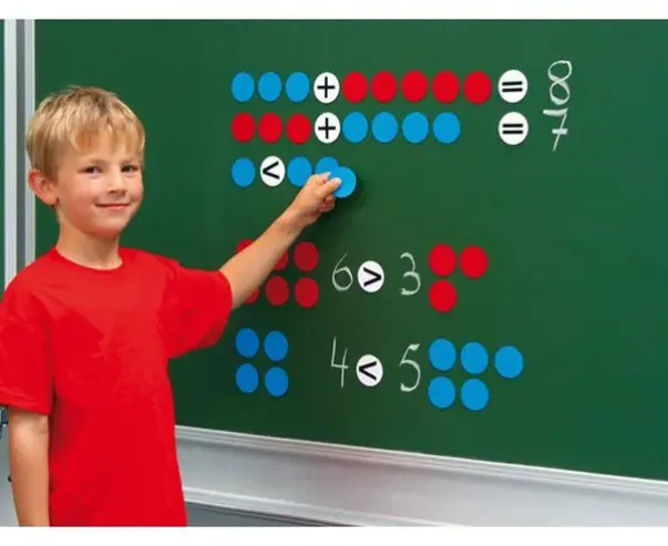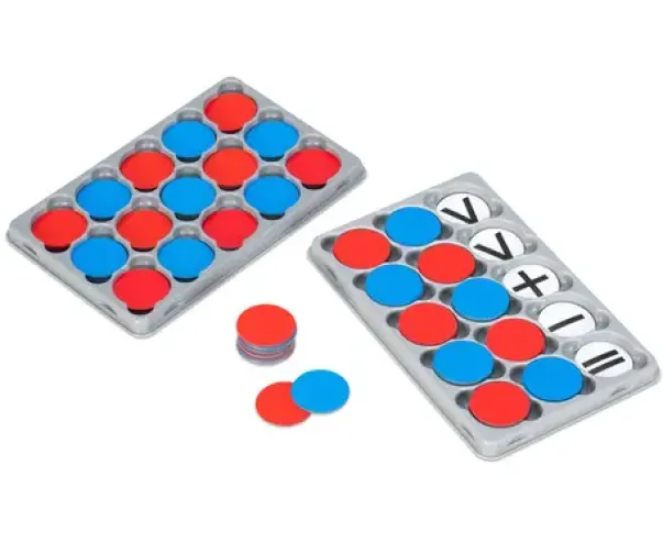 I pakken følger det med 100 tofargete brikker og 20 symboler. De 5 cm store brikkene er røde på den ene siden og blå på den andre siden. Foruten addisjon og subtraksjon, medfølger også brikker med symbolene større enn og mindre enn. Den visuelle framstillingen vil gjøre det enklere å forstå mattestykkene.