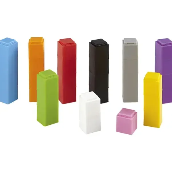 Settet består av 100 klosser. Mål: 2 x 2 cm.