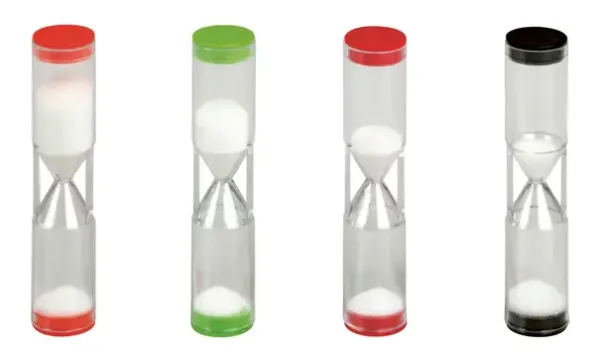 Tidsintervallene er fra 30 sekunder til 10 minutter. La barna eksperimentere, der de eksempelvis kan stå på ett ben i 30 sekunder eller hoppe opp og ned i 5 min. Timeglassene kommer i en koffert av plast for oppbevaring.