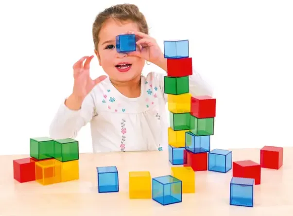 Store kuber, 4 x 4 cm, gjennomsiktig i 4 farger. Spennende å kunne se igjennom og bygge med, telle og sortere.