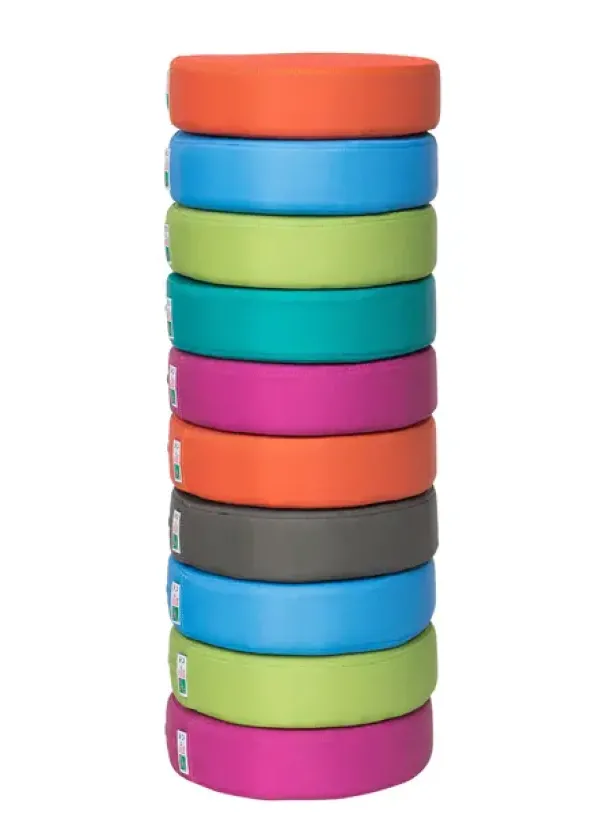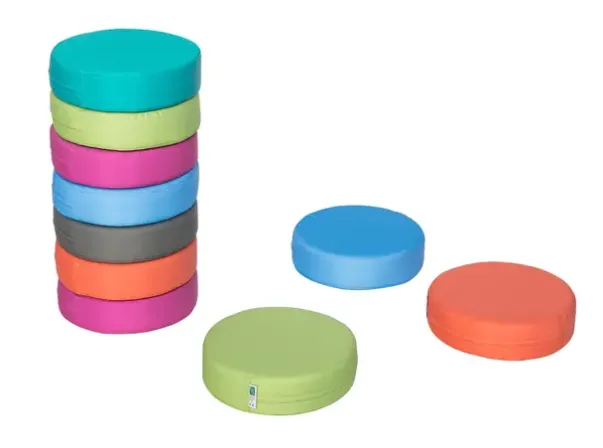 Sett med 10 sitteputer gjorda av skum och nylon. Nylon har en sammansättning av 50% polyester och 50% bomull. Tyget är extremt slitstarkt och kan torkas av med en fuktig trasa. Baksidan av kuddarna kommer med en halkskyddsbeläggning.