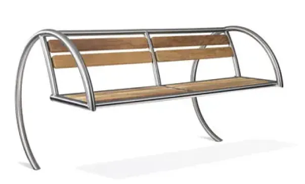 Laget i rustfritt stål og tre, sittehøyde 50cm, L: 280cm, B 100cm