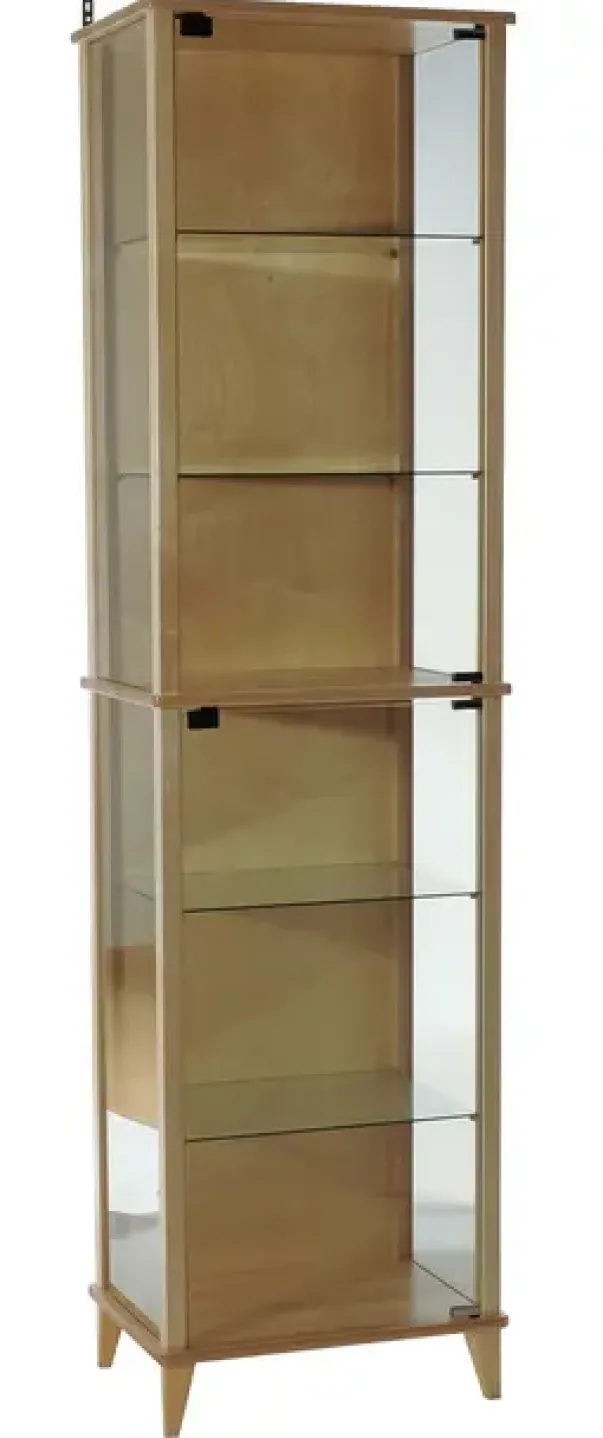 Utstillingsmonter i bjørk og sikkerhetsglass. Skapet passer godt til å presentere store og små kunstprosjekter eller tema til undervisning.