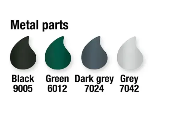 Farge: Leveres som std i fargene: Sort RAL 9005, Mørk grønn RAL 6012 og Mørk grå RAL 7024.