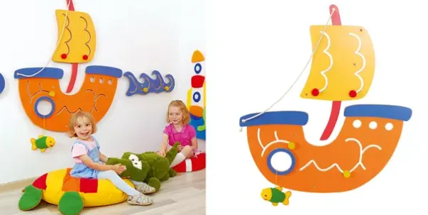 Skip veggleke. Str B:93 x H:108 cm. Veggleker er en morsom måte å lære skrive- og tegnebevegelser på. Store knotter og myke bevegelser langs kurvede utskjæringer hjelper å utvikle motorikken. Produsert i laminert MDF.