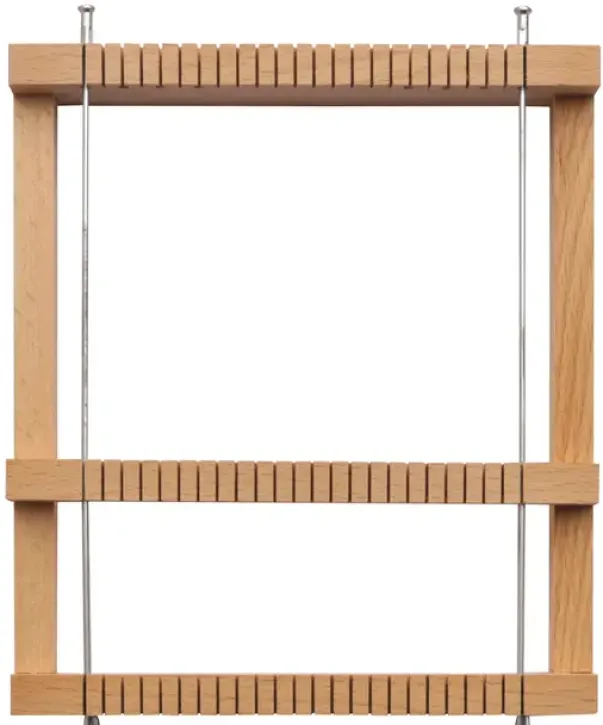 Vevene har metallspiler på begge sider som skal veves rundt, slik at ikke veven blir smalnet inn på midten. Vevenål av tre følger med.