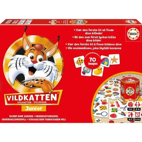 Med Villkatten Junior kan du øve refleksene og lære å skjelne mellom de ulike bildene. Du blir raskt en ekspert. Hvem finner de morsomme bildene først?En løve, et skip, en katt, en snegle, en elefant og et fly!Observer, let og bruk raske reflekser for å finne bildene og dermed vinne. Den spilleren som klarer å sette sammen flest firkantede kort og figurkort, vinner spillet.