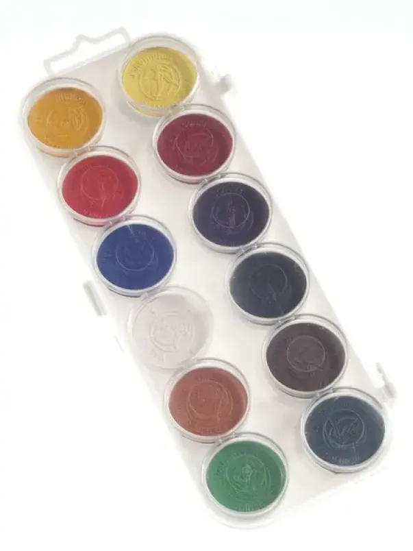Akvarellfargeskrin med 12 ulike farger. God kvalitet til skolebruk.