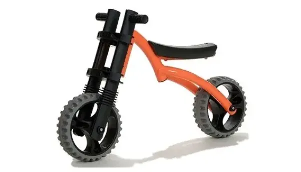 Design: Ramme med høy klaring og store hjul for sykling på en rekke overflater. Forgaffel med bredere vinkel for å etterligne en standard sykkel. Ikke justerbar, men har et langt sete, som gir mange sittemuligheter etter hvert som barnet blir større.