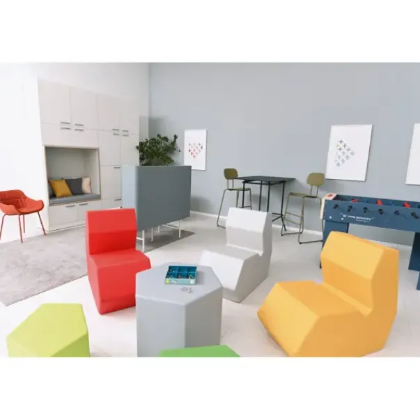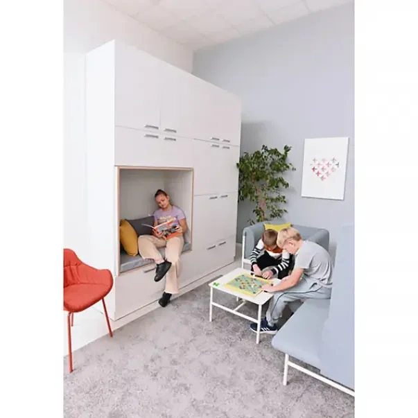 Oppbevaringsmodul utført i 18 mm direktelaminert møbelspon. Lesehule i høytrykkslaminert kryssfiner. Lesehulen leveres inkludert sittemadrass i skum med trekk i slitesterkt kunstskinn. Rom bak de største dørene leveres med 1 stk. flyttbar hylle.